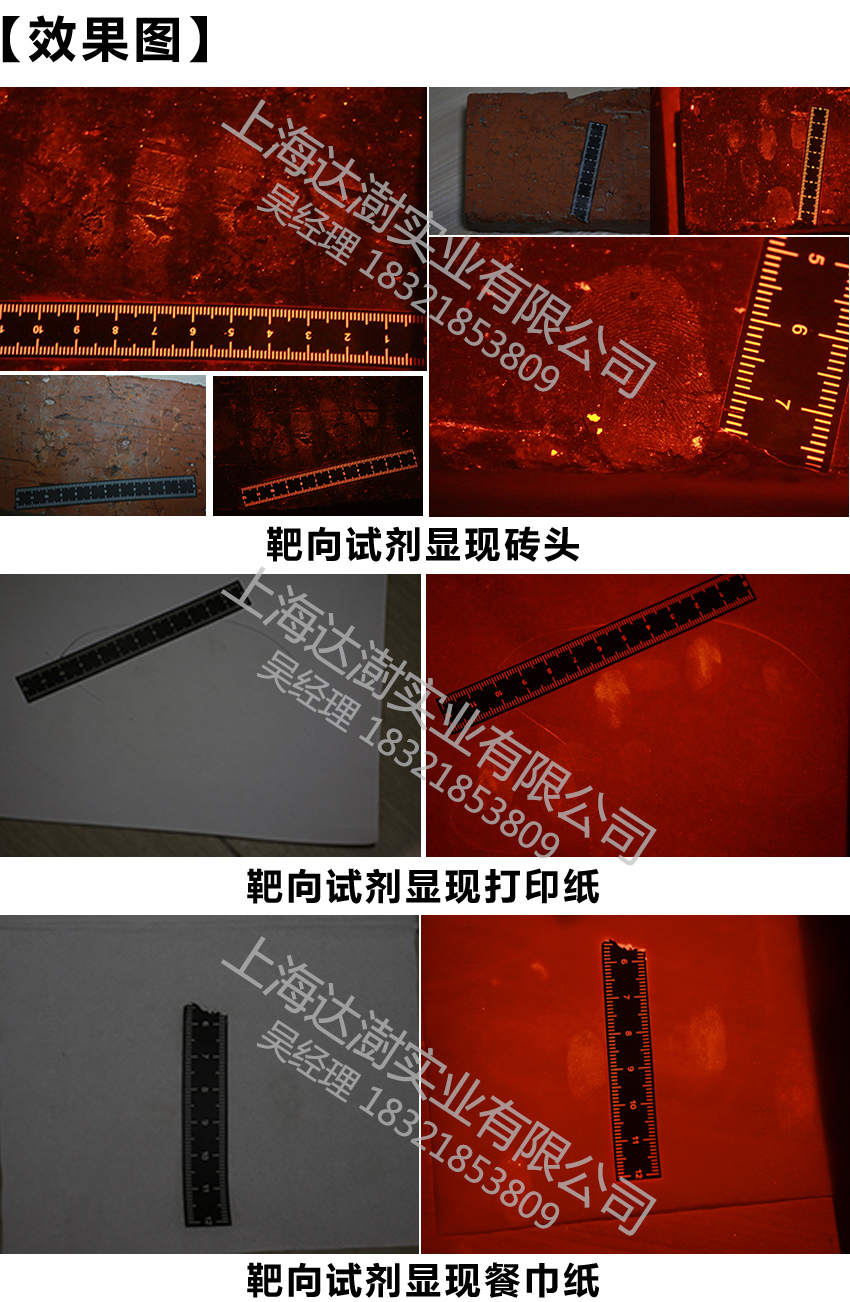 配合DNA靶向試劑可快速顯現(xiàn)磚塊、石頭、紙張、木頭等疑難客體的生物痕跡。試劑成份安全,不破壞DNA結(jié)構(gòu)。